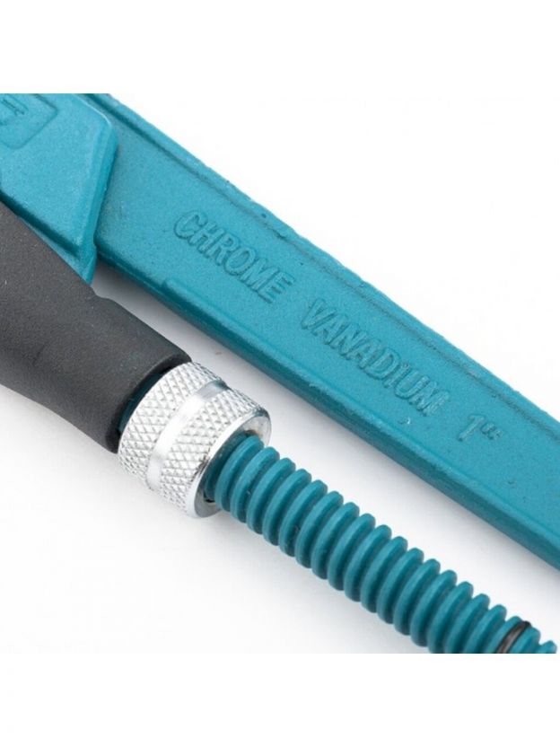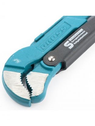 Ключ трубный рычажный типа S усиленной конструкции, применяется при повышенных нагрузках. Предназначен для захватывания и вращения труб и соединительных частей трубопроводов. Изготовлен из высококачественной хромованадиевой стали. Имеет порошковое антикоррозийное покрытие. Губки дополнительно закалены токами высокой частоты до твердости 57–60 HRС. Прогрессивная форма зуба с наклоном против направления вращения обеспечивает самоблокируемый захват деталей. Верхняя ручка имеет выштампованный Т-образный профиль. Регулировочная гайка снабжена стопорным кольцом.