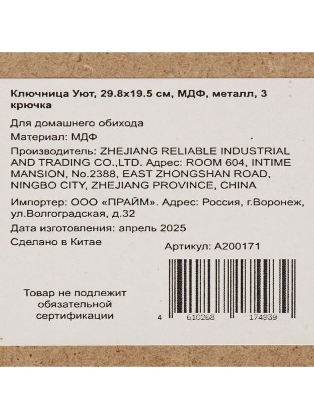 В ключнице «Уют» три металлических крючка, цвет — бежевый, материал корпуса — МДФ, страна производства — Китай.