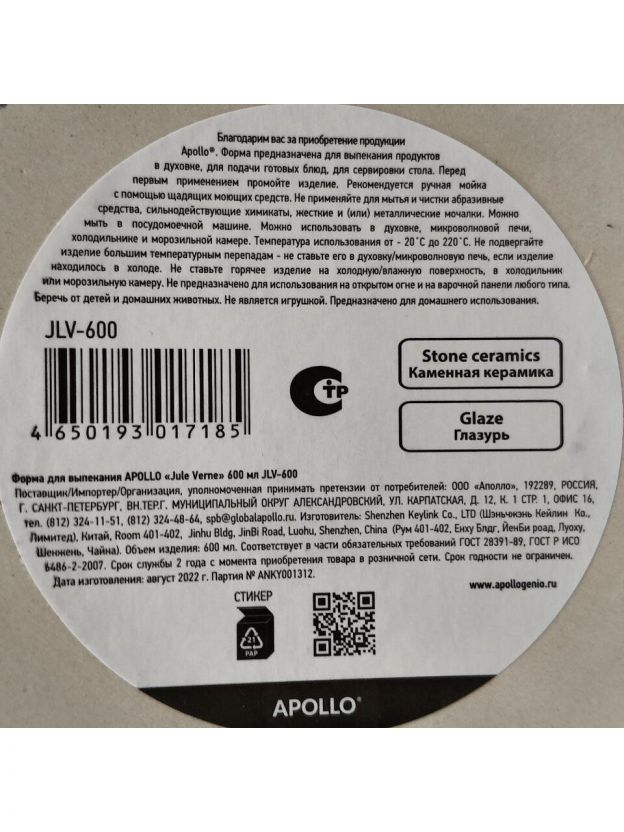 Кокотница из коллекции Apollo Jule Verne — это круглая форма из жаропрочной керамики, которую часто ищут как «купить недорого кокотницу для дачи» или «что лучше для суфле». Благодаря прочной керамике без антипригарного покрытия, посуда безопасна для здоровья, не выделяет вредных веществ при нагреве и не впитывает запахи. В отличие от металлических форм, керамика равномерно распределяет тепло, что важно для нежных десертов и выпечки. Форма выдерживает запекание в духовке и разогрев в микроволновке, что удобно для быстрого приготовления и подогрева блюд.