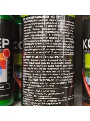Колеровочная паста Русские узоры предназначена для колерования красок, эмалей, лаков, лазурей для дерева, штукатурок и затирок на водной, масляной и других органических основах. Паста подходит только для внутренних работ.