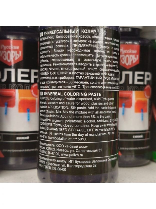 Колеровочная паста Русские узоры предназначена для колерования красок, эмалей, лаков, лазурей для дерева, штукатурок и затирок на водной, масляной и других органических основах. Паста подходит для внутренних и внешних работ.