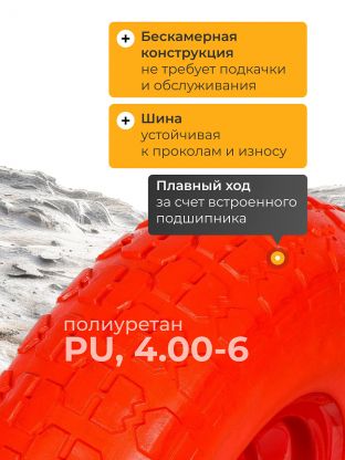 Колесо для тачки полиуретан PU, 4.00-6, втулка D16 мм, Мастер Инструмент — надежное решение для тех, кто ценит комфорт и долговечность при работе на участке или стройке. Прочное полиуретановое колесо с подшипником обеспечивает плавное движение даже по неровной поверхности, а бескамерная конструкция избавляет от необходимости регулярного обслуживания и подкачки. Диаметр 325 мм и втулка 16 мм делают монтаж максимально простым и быстрым, а универсальность позволяет использовать изделие для различных типов тачек — как садовых, так и строительных.