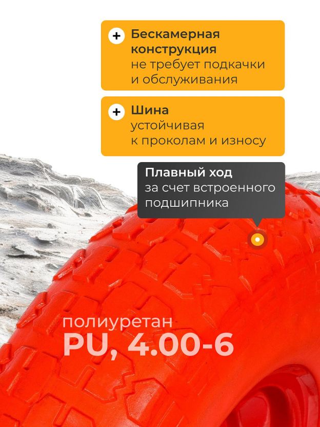 Колесо для тачки полиуретан PU, 4.00-6, втулка D20 мм, Мастер Инструмент — идеальное решение для тех, кто ценит надежность и долговечность при выборе комплектующих для садовой или строительной тачки. Современный полиуретановый материал гарантирует устойчивость к проколам, износу и агрессивным условиям эксплуатации, а также обеспечивает долгий срок службы даже при интенсивном использовании. Бескамерная конструкция шины избавляет от необходимости регулярного подкачивания, что особенно актуально для дачных и строительных работ, где важна максимальная практичность и экономия времени.
