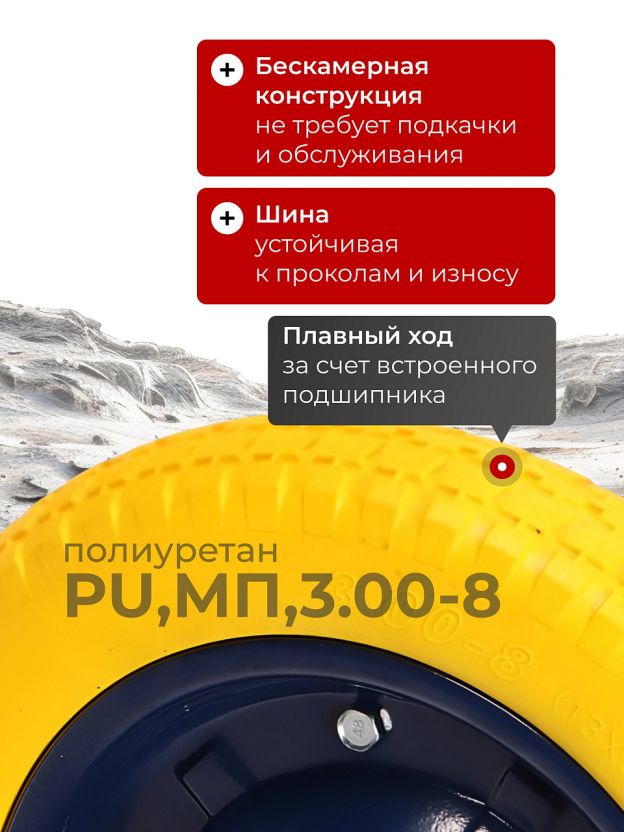 Полиуретановая бескамерная шина гарантирует плавный ход и отличную маневренность даже на неровной поверхности, что особенно важно при перевозке тяжелых грузов по участку или строительной площадке. Прочная втулка диаметром 16 мм и длиной 90 мм обеспечивает надежное крепление и легкость установки. Колесо оснащено подшипником, что существенно облегчает движение тачки и снижает нагрузку на руки при работе.