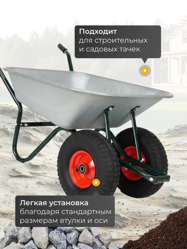 - Универсальный размер: диаметр колеса 250 мм, втулка D20 мм, толщина 80 мм — подходит для большинства садовых и строительных тачек;