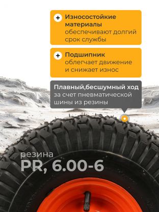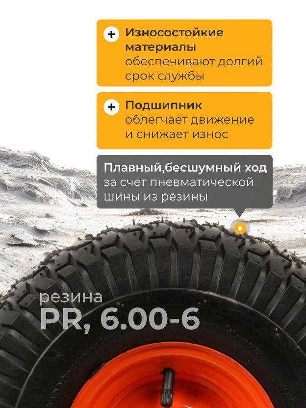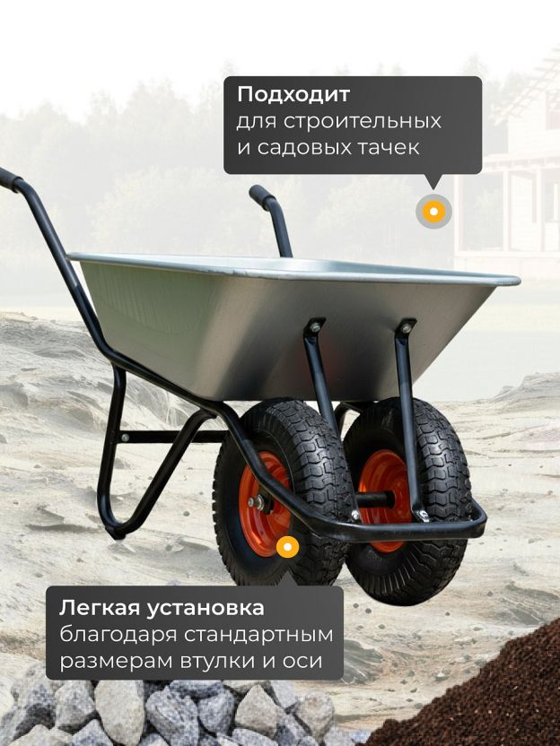 Пневматическая шина легко справляется с различными типами грунта, а благодаря прочной конструкции колесо выдерживает значительные нагрузки. Решение для тех, кто ценит комфорт и эффективность при транспортировке сыпучих материалов, земли, песка, строительных смесей и других грузов. Универсальность позволяет использовать колесо как для садовой, так и для строительной тачки, что расширяет сферу применения и экономит бюджет.