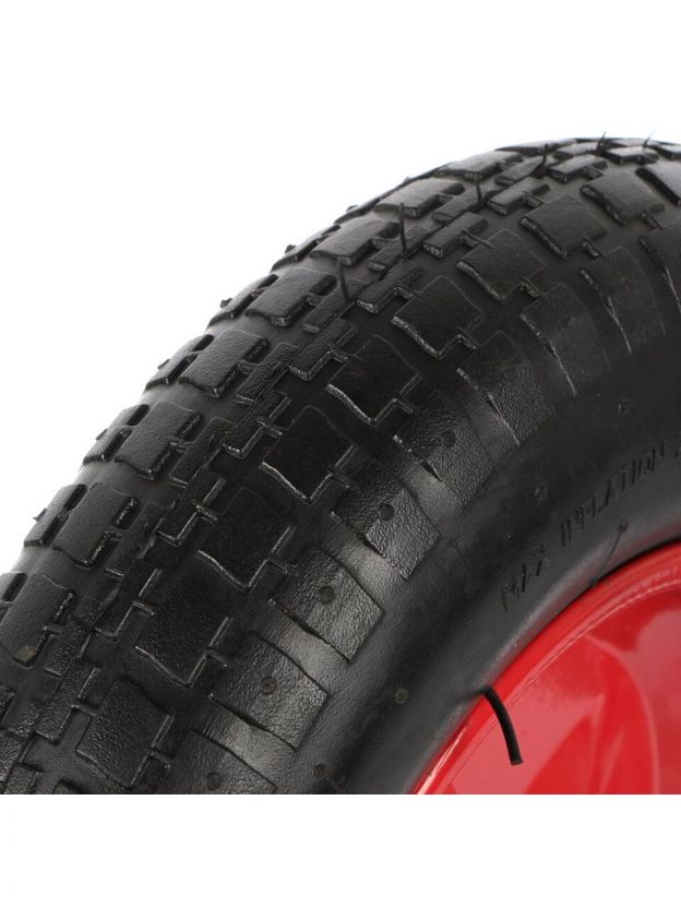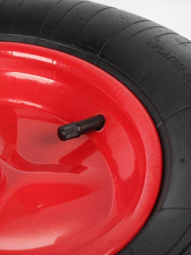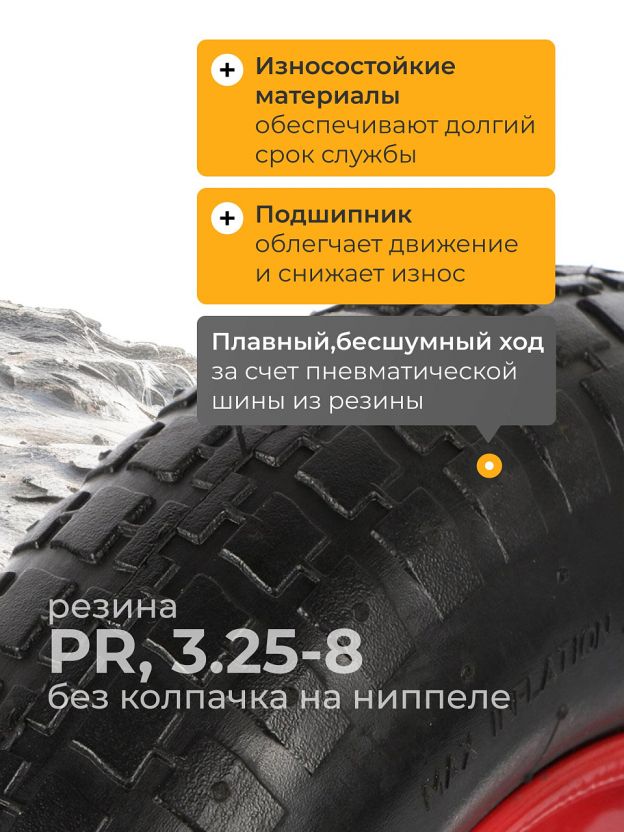 Колесо для тачки резина PR, без колпачка на ниппеле, 3.25-8, втулка D20 мм, Мастер Инструмент — надежное решение для эффективной работы на даче, в саду или на строительной площадке. Прочный материал шины и наличие подшипника гарантируют долгий срок службы и легкость движения даже при интенсивной эксплуатации. Благодаря универсальному размеру 3.25-8 и втулке диаметром 20 мм, изделие подходит для большинства садовых и строительных тачек, что делает его востребованным вариантом для замены изношенных колес. Пневматическая шина обеспечивает отличную амортизацию, снижая нагрузку на руки и минимизируя вибрации на неровных поверхностях, что особенно актуально для грунтовых дорожек и участков с камнями.