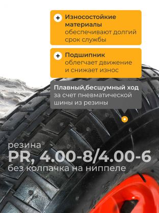 Колесо для тачки резина PR, без колпачка на ниппеле, 4.00-8/4.00-6, втулка D20 мм от бренда Мастер Инструмент — надежное решение для эффективной транспортировки грузов на строительной или садовой тачке. Прочный материал шины и качественная сборка гарантируют долговечность, устойчивость к износу и отличную проходимость даже по неровным и сложным поверхностям. Благодаря универсальному размеру 4.00-8/4.00-6 и втулке диаметром 20 мм, установка колеса не вызовет затруднений и обеспечит надежную фиксацию на оси длиной 90 мм. Пневматическая конструкция шины обеспечивает плавный ход, снижает вибрацию и позволяет перевозить тяжелые грузы без лишних усилий.