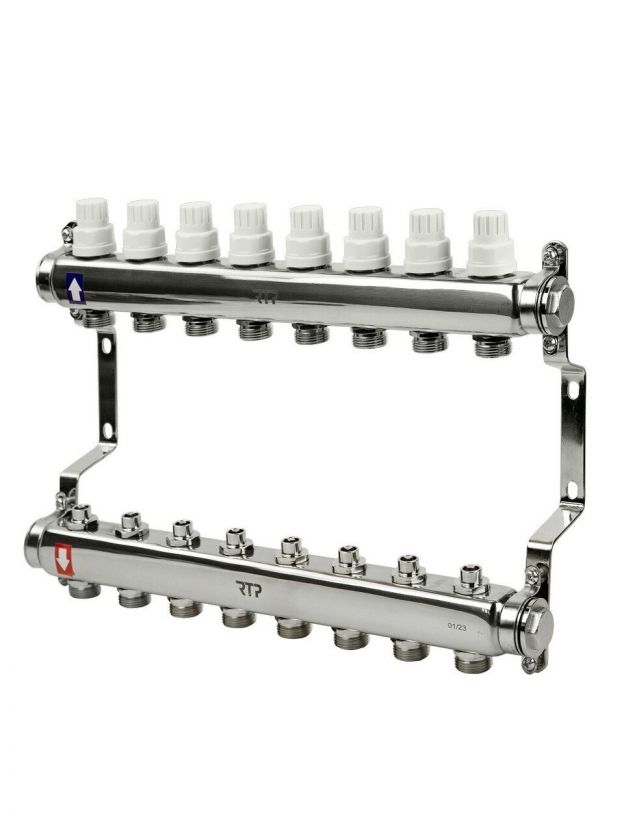 Коллекторная группа 3/4", с ручными клапанами и кронштейном, 1"х 8 выходов, РосТурПласт