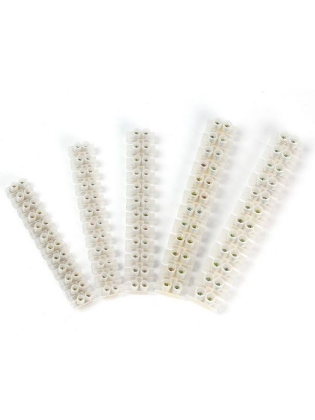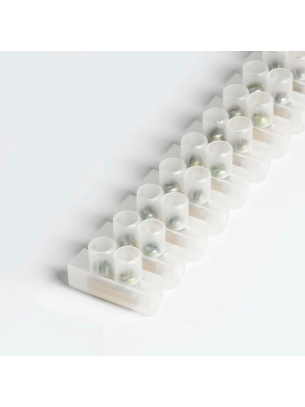 Применяются для винтового соединения проводников, защищая провод от повреждения и исключая возможность замыкания на корпус электроустановки. Изоляционный каркас изготовлен из белого негорючего прозрачного полиэтилена, клемма и винты – латунь.