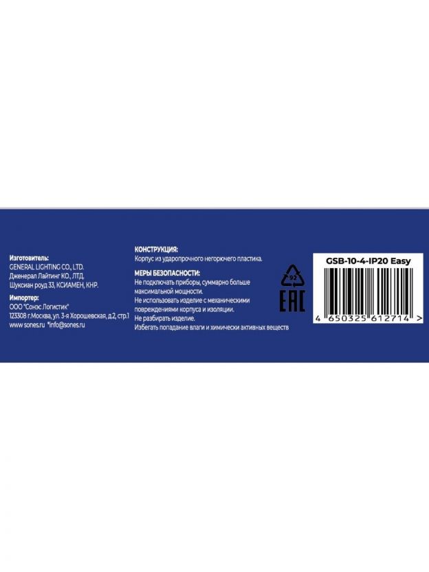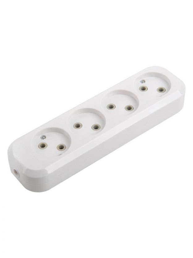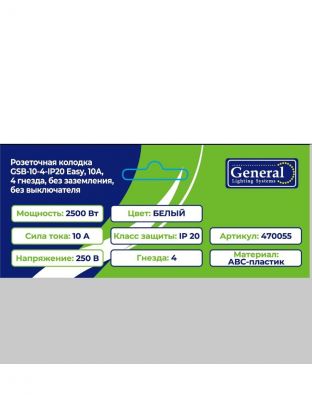 Колодка розеточная 4 гнезда, 2 полюса, без заземления, 10 А, 220 В, 2.2 кВт, без выключателя, IP20, General Lighting Systems, Easy GSB-10-4-IP20, 470055
