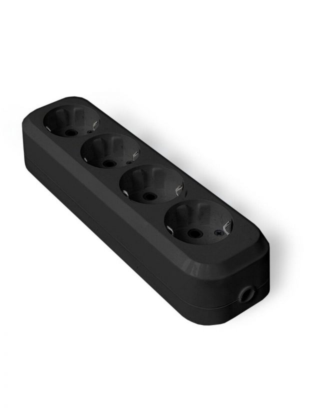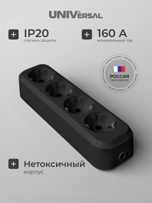 Колодка розеточная 4 гнезда, с заземлением, 16 А, черный, UNIVersal, 1401