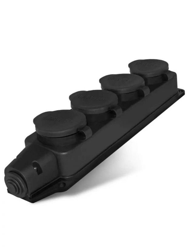 Колодка розеточная 4 гнезда, с заземлением, 16 А, с заглушкой, 1-фазная, IP44, каучук, черный, UNIVersal, Компакт