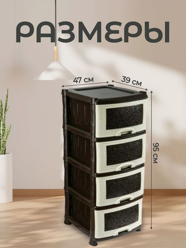 Комод с четырьмя ящиками «Ажур» — это современная альтернатива деревянным и плетёным моделям. Благодаря пластиковому корпусу, изделие не боится влаги и легко очищается, что особенно важно для дачи или кухни. Удобные полозья позволяют плавно выдвигать ящики, а отсутствие лишних полок делает комод максимально вместительным. Часто спрашивают: «Как выбрать комод для хранения мелочей?» — обратите внимание на высоту и глубину: 95х39 см оптимальны для экономии пространства и размещения в узких нишах.