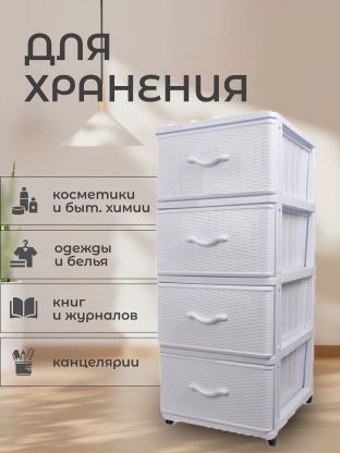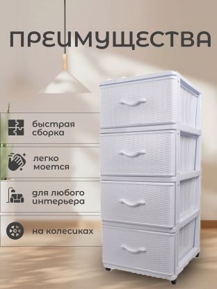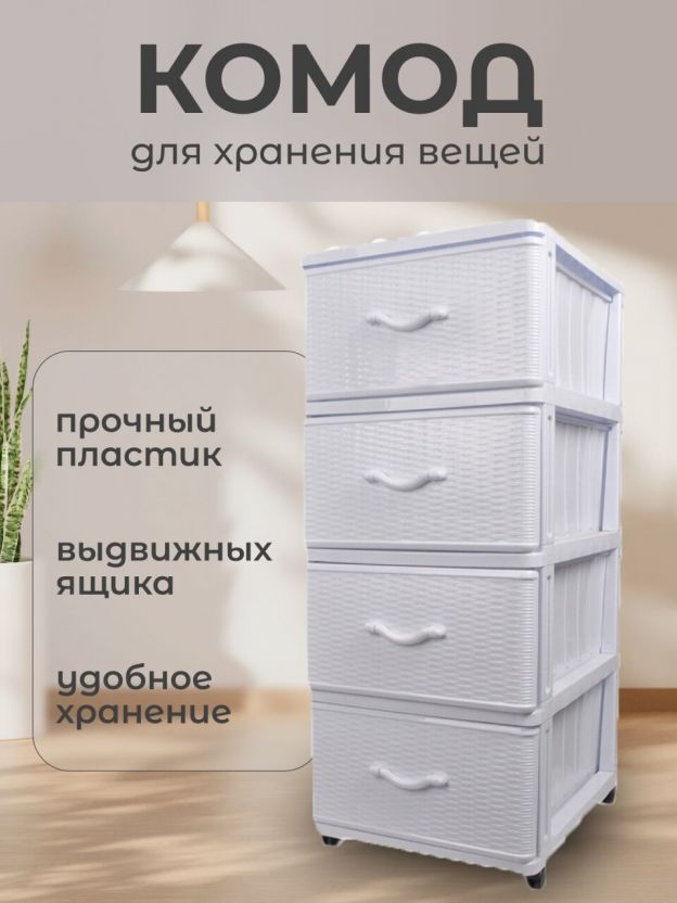 Комод с четырьмя выдвижными ящиками - удобное и практичное решение для хранения вещей в вашем доме. Изготовленный из высококачественного пластика, он отличается прочностью и долговечностью, а также устойчивостью к воздействию влаги и солнечных лучей. Небольшой, но при этом вместительный комод позволит разместить в нем все необходимые предметы, начиная от одежды и заканчивая постельным бельем и аксессуарами. Благодаря своему современному дизайну и белому цвету комод прекрасно впишется в любой интерьер, а наличие колесиков на нижней части комода, позволит перемещать его с места на место при необходимости. Колесики входят в комплектацию. Характеристики. Тип: комод. Материал: пластик. Габариты (ВхШхГ): 94х40х50 см. Высота ящиков: 20 см. Высота без колесиков: 91 см. Количество ящиков: 4 шт. Инструкция по сборке расположена на упаковке. Особенности конструкции: оснащен колесиками. Цвет: белый. Преимущества. Изготавливаются из высококачественного материала, что обеспечивает его прочность и долговечность. Пластик легко моется и не требует специального ухода. Подходит для детской и ванной комнат, спальни, кухни и коридора. Комод выполнен в стильном белом цвете, что делает его идеальным для любого интерьера. Удобный и функциональный комод поможет организовать пространство вашего дома, а наличие колесиков позволит легко перемещать его из одного места в другое, что поможет сэкономить время и силы на уборку. Товар поставляется в полной комплектации, приобретение отдельных элементов не представляется возможным.