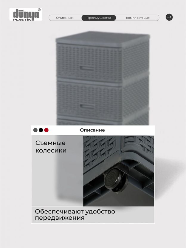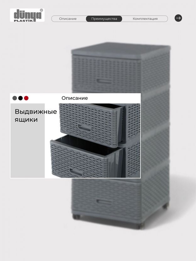 Комод "Дюна" выполнен в элегантном цвете антрацит, который гармонично впишется в любой интерьер. Плетеная текстура придает изделию особый шарм и утонченность, создавая впечатление легкости и воздушности. Высококачественный пластик, из которого изготовлен корпус и фасад комода, гарантирует долговечность и простоту в уходе.