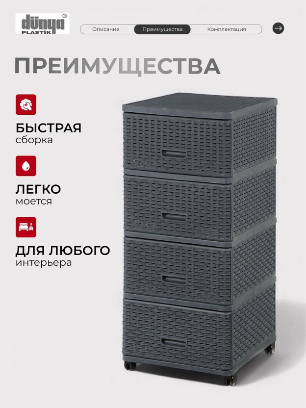 С помощью четырех вместительных ящиков можно легко организовать хранение вещей, будь то одежда, аксессуары или бытовые мелочи. Размеры комода — 40х50х98 см — позволяют разместить его даже в небольших помещениях, экономя драгоценное пространство. Комод оснащен полозьями, что обеспечивает плавное и бесшумное выдвижение ящиков, а наличие колес делает его мобильным и удобным в использовании.
