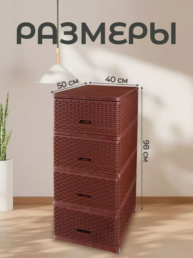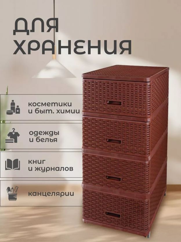 Комод 4 ящика Дюна 40х50х98 см — практичное и стильное решение для хранения вещей в любом современном интерьере. Благодаря компактным размерам и узкой форме комод идеально впишется даже в ограниченное пространство, позволяя организовать порядок в доме или на даче. Коричневый цвет и плетеная фактура фасадов придают изделию актуальный внешний вид, который легко сочетается с различными стилями оформления помещений. Прочный пластик обеспечивает долгий срок службы, устойчив к влаге и легко очищается, что особенно важно для ежедневного использования.