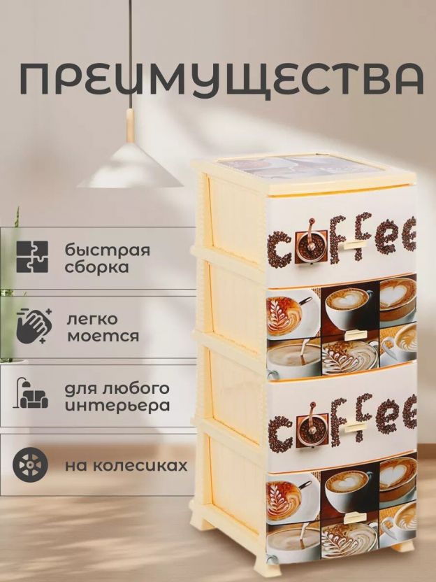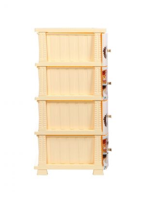 Современный дизайн, яркие картинки и разнообразные цветовые решения пластикового комода органично дополнят любой интерьер. В комоде есть четыре объёмных, легко выдвигающихся ящика, в которых можно хранить чай/кофе, конфеты если он стоит на кухне или например косметику, предметы личной гигиены или мелкие детали гардероба (колготки, галстуки, ремни) или любые принадлежности. Характеристики: Размер: 38 х 48 х 98 см; Габариты одного ящика ШхГхВ: 30х40х20 см. Цвет: бежевый; Количество ящиков: 4; Материал: пластик. Преимущества: Особенностью производства комода серии Декор является вживляемая печать на пластик. Пластиковый комод не имеет острых углов, компактен, легко моется. Пластиковые ножки не нанесут вреда напольному покрытию и коврам. Пластик, как материал, не подвержен коррозии, действию влаги, не рассыхается, благодаря этому прослужит не один год. Дополнительная информация: Максимальная нагрузка на 1 ящик: 2.5 кг.