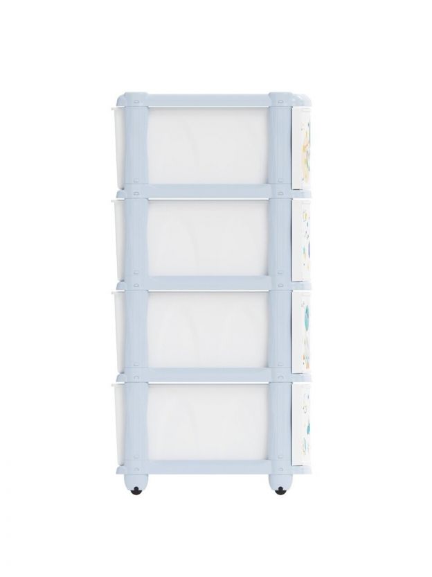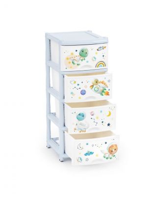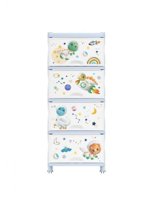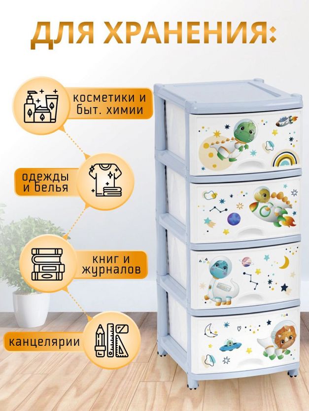 Комод укомплектован четырьмя выдвижными ящиками и ножками с колесиками. Оригинальный рисунок придется по душе каждому ребенку.