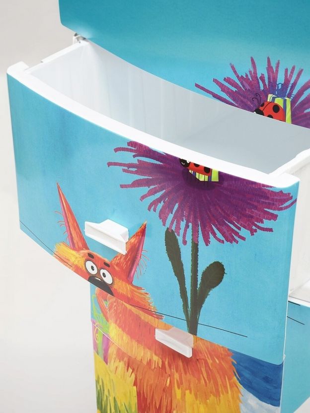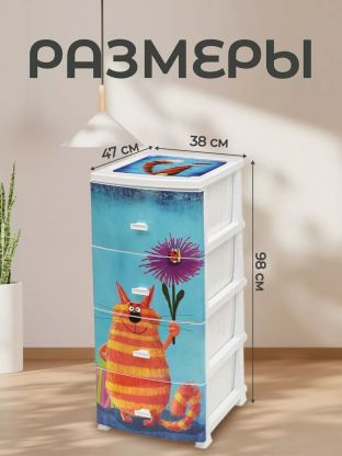 Комод оснащён четырьмя вместительными ящиками, которые легко выдвигаются благодаря качественной фурнитуре. Прочный пластик отличается долговечностью, устойчив к влаге и механическим повреждениям, что особенно важно для детской мебели. Яркий фасад с изображением кота привлечёт внимание ребёнка и сделает процесс уборки увлекательным и простым. Такой комод не только функционален, но и безопасен для малышей – в конструкции отсутствуют острые углы и мелкие детали.