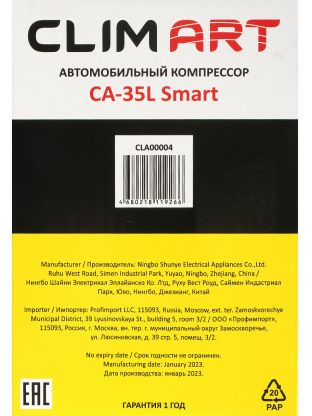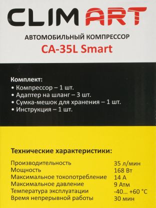 Компрессор автомобильный Clim Art, CA-35L Smart, 35 л/мин, 12 В, 7 атм, 168 Вт, к прикуривателю, сумка, CLA00004