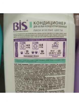 Средства BIS созданы с любовью и заботой о вас и ваших вещах. В сердце формулы лежит комплекс целлюлаз, который отвечает за восстановление волокон ткани: разглаживание, смягчение, предотвращение появления катышек и ворсинок, что помогает продлить жизнь любимым вещам! Невероятные ароматы, созданные совместно с европейскими парфюмерами, принесут вам одно удовольствие от использования данного продукта. Характеристики: Объем: 0,9 л; Состав: _5 %, но _15 % КПАВ; _5 %: консервант, ароматизирующая добавка; Бренд: BIS. Преимущества: Придаёт тканям мягкость и свежий аромат. Значительно облегчает глажение. Обладает антистатическим эффектом. Подходит для всех видов тканей. Способ применения: В зависимости от способа стирки кондиционер следует использовать при полоскании белья в количестве, указанном ниже (рекомендуется использовать колпачок от флакона). После полоскания с кондиционером бельё следует высушить без дополнительного полоскания в чистой воде. Машинная стирка: добавить кондиционер в стиральную машину из расчёта 60 мл кондиционера на 3-5 кг стираемого белья в соответствии с инструкцией к стиральной машине. Ручная стирка: при последнем полоскании белья развести кондиционер в воде из расчёта 60 мл на 10 л воды. В полученном растворе бельё следует хорошо прополоскать, после чего отжать и высушить. Внимание! Флакон с кондиционером следует хорошо встряхивать перед каждым применением! Для достижения наилучшего эффекта при полоскании махровых изделий дозировку средства рекомендуется увеличить в 1,5 раза. Если при стирке используется пятновыводитель или отбеливатель, то перед применением кондиционера бельё необходимо тщательно прополоскать в чистой воде. Неразбавленный кондиционер непосредственно на ткани лить не рекомендуется.
