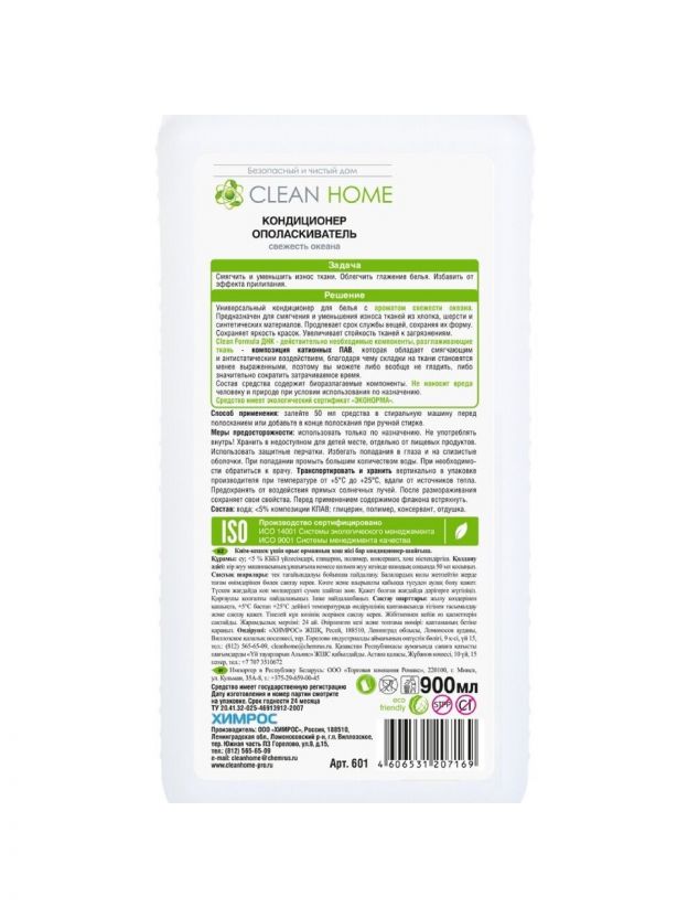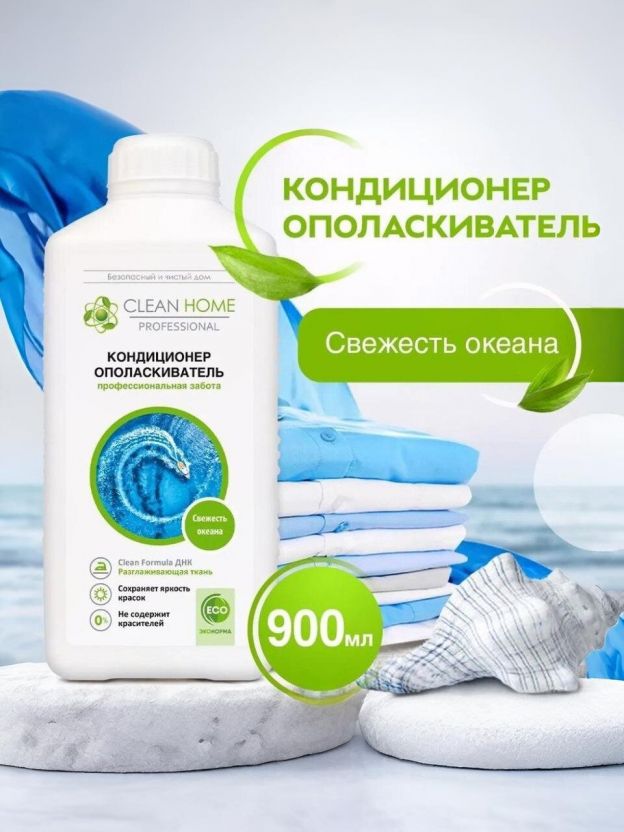 Кондиционер для белья Clean Home "Свежесть океана", 900 мл — идеальное решение для придания белью мягкости и свежего аромата. Формула помогает облегчить глажку, придаёт тканям приятную нежность, а также сохраняет их свежесть надолго. Подходит для ежедневного использования, не содержит концентрированных компонентов, что делает его оптимальным выбором для заботы о вещах.