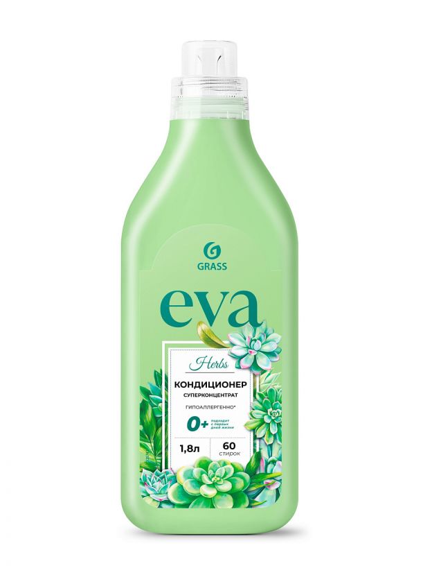 Концентрированный кондиционер для белья Grass Eva Herbs 1.8 л: свежесть, мягкость и экономия до 60% на каждой стирке — для заботы о вашей семье и бюджете.