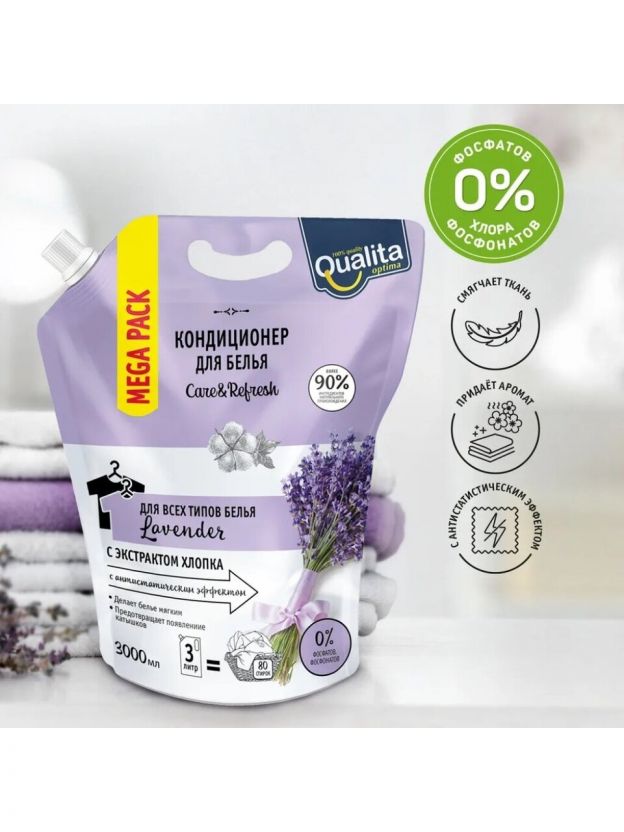 Концентрированная жидкая формула кондиционера Qualita "Lavender" хорошо растворяется в воде, делая бельё мягким, шелковистым и приятным на ощупь. Кондиционер устраняет статическое электричество и облегчает глажение, придавая приятный аромат свежести. Благодаря защитному слою, который образуется на поверхности ткани после стирки с кондиционером, вещи дольше остаются чистыми. Экстракт хлопка восстанавливает ткань и защищает от образования катышков.