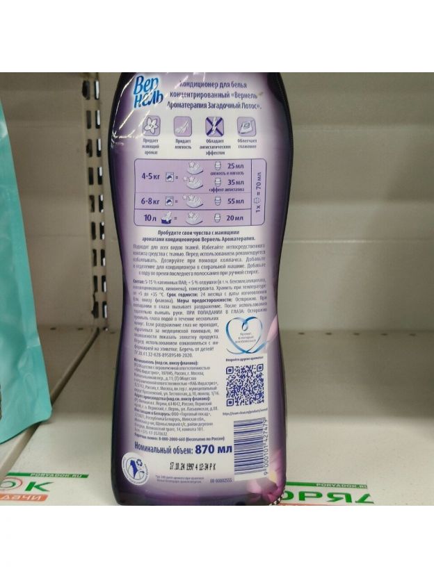Концентрированный кондиционер для белья Вернель Ароматерапия Загадочный лотос 870 мл (34 стирки) подарит Вашему белью не только невероятную мягкость, но и магический аромат лотоса, а благодаря специальным аромакапсулам в составе кондиционер для стирки Вернель позволит наслаждаться интенсивным ароматом белья до 140 дней. Преимущества: кондиционер для белья обеспечивает аромат до 140 дней (при хранении белья без использования). кондиционер содержит в составе эфирные масла, дарящие вдохновение для души и тела. кондиционер для стирки придает приятный аромат и мягкость белью. кондиционер для стирки облегчает глажку и обладает антистатическим эффектом. дарит чувственный яркий аромат черной орхидеи с яркими оттенками пачули. на одну стирку достаточно меньше половины колпачка. Подходит для всех видов тканей. Избегайте непосредственного контакта средства для стирки с тканью. Рекомендации: Концентрированный ополаскиватель для белья Вернель просто использовать. Благодаря удобной крышке-дозатору Вы всегда будете знать, сколько ополаскивателя для белья необходимо добавить в отделение для кондиционера в стиральной машине или в воду во время последнего полоскания при ручной стирке. Концентрированного средства для стирки хватает на длительное время. Его не нужно разбавлять водой. Перед использованием рекомендуется взбалтывать. Информация по дозировке указана на обратной стороне упаковки. Состав: 5-15% катионных ПАВ; менее 5% отдушки (в т.ч. бензилсалицилата, гексилциннамаля, лимонена), консерванта. Условия хранения: Хранить при температуре от +5 до +35°С.
