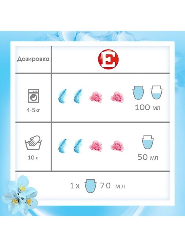 Кондиционер для белья E бережно и деликатно ухаживает за любой одеждой. Благодаря современной формуле из катионных ПАВ и глицерина кондиционер обладает эффективными преимуществами: