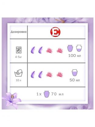 Ополаскиватель для белья Е просто использовать. Благодаря удобной крышке-дозатору Вы всегда будете знать, сколько ополаскивателя для белья необходимо добавить в отделение для кондиционера в стиральной машине или при ручной стирке. Его не нужно разбавлять водой. Перед использованием рекомендуется взбалтывать. Информация по дозировке указана на обратной стороне упаковки