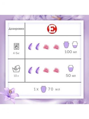 Ополаскиватель для белья Е просто использовать. Благодаря удобной крышке-дозатору Вы всегда будете знать, сколько ополаскивателя для белья необходимо добавить в отделение для кондиционера в стиральной машине или при ручной стирке. Его не нужно разбавлять водой. Перед использованием рекомендуется взбалтывать. Информация по дозировке указана на обратной стороне упаковки