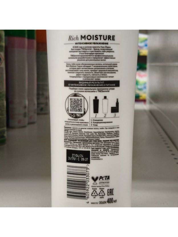 Увлажняющий кондиционер TRESemm_ Rich Moisture с гиалуроновым комплексом для сухих волос эффективно питает и увлажняет пряди. Кондиционер подходит для всех видов сухих волос, а также для ежедневного применения. Роскошный аромат раскрывается композицией, наполненной нотами малины, в сочетании с личи на древесной базе, дополненной уникальной нотой розы. Характеристики: Объем: 400 мл. Назначение: для сухих волос. Способ применения: нанесите на мокрые неотжатые волосы, отступая 5-10 см от корней, расчешите их пальцами и смойте. Преимущества: Придает здоровый внешний вид. Помогает сократить ломкость. Дарит гладкость. Обеспечивает мягкость. Придает блеск. Подарите своим волосам непревзойдённую красоту и глубокое восстановление с помощью увлажняющего кондиционера TRESemm_ Rich Moisture. Ваши локоны станут мягкими, блестящими и крепкими, наполнившись здоровьем и силой.