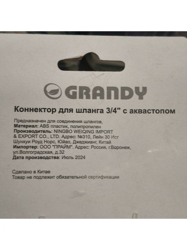 Коннектор для шланга 3/4", быстросъемный, автостоп, Grandy, JS-327