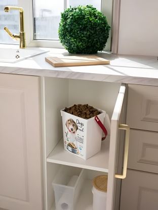 Объёмный контейнер с крышкой предназначен для хранения сухого корма для животных. Это гораздо удобнее, чем держать большие пакеты, из которых корм может просыпаться. Плотно закрывающаяся крышка предотвращает заветривание корма, попадание влаги и вредителей, сохраняя вкусовые качества продукта. Изделие изготавливается из пищевого пластика.