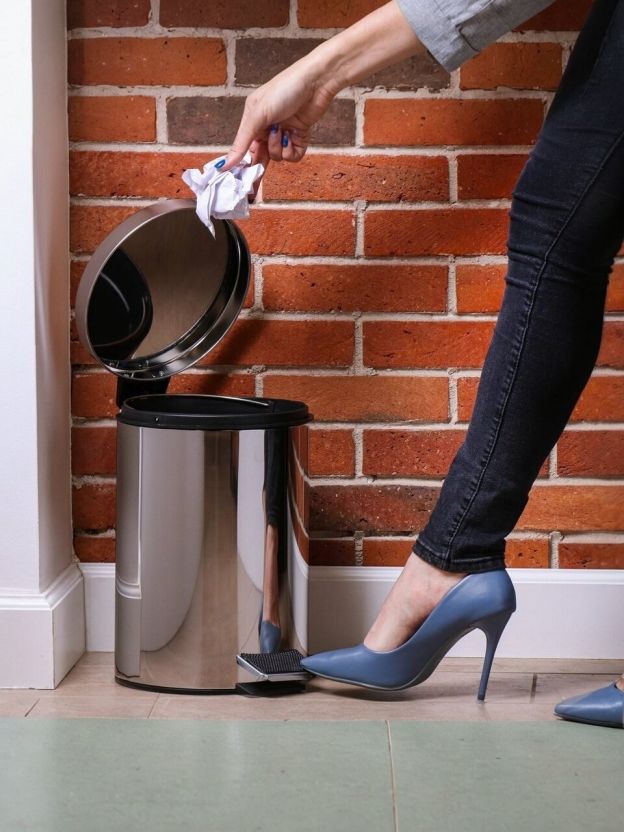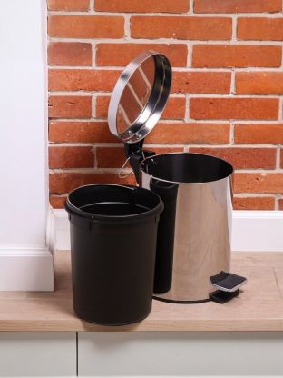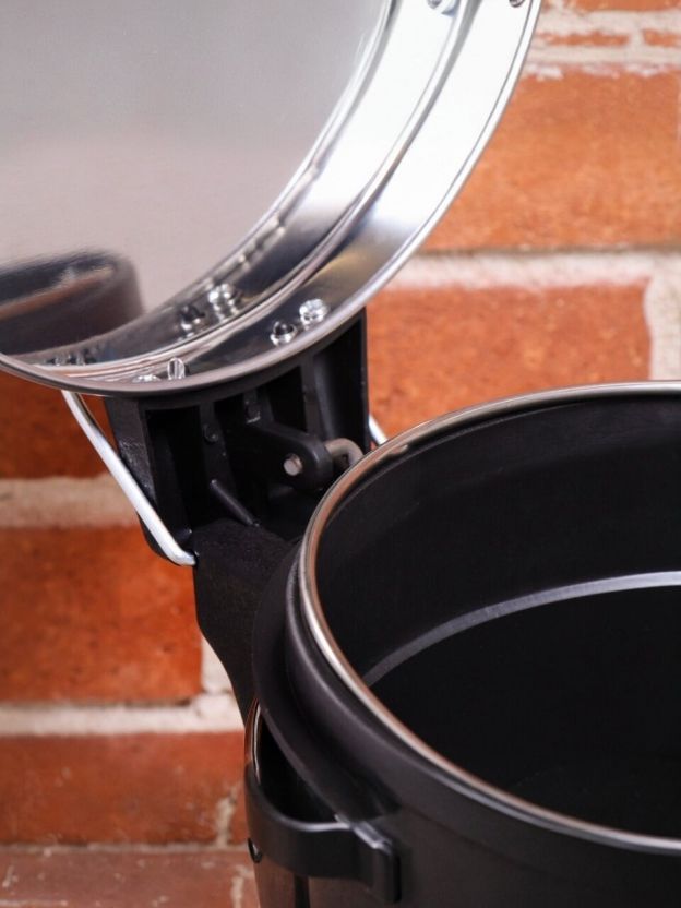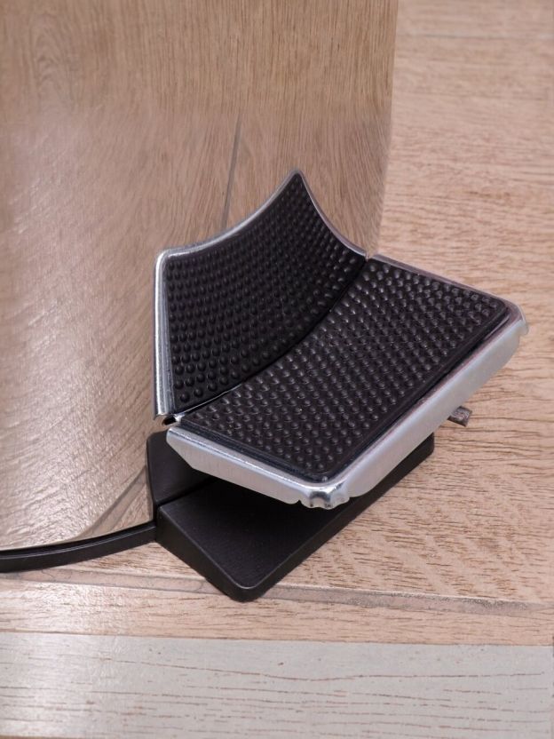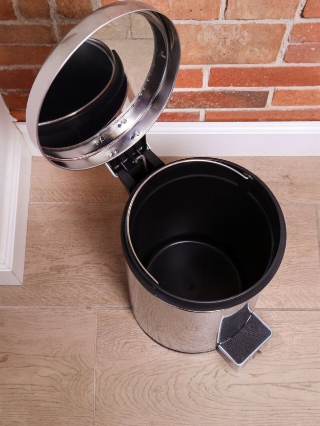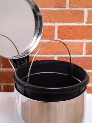 Педаль позволяет открывать крышку ногой, не касаясь руками — это удобно для кухни, где важна гигиена. Металлический корпус легко очищается и не впитывает запахи.