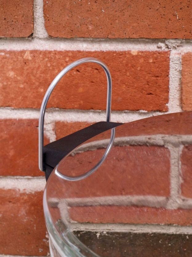Высота — 33 см, длина и ширина — по 22,5 см. Изготовлен из прочного металла с хромированным покрытием, оснащён ручкой для переноски и плотно закрывающейся крышкой.