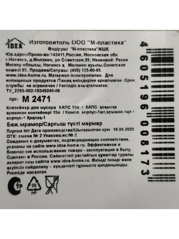 Контейнер для мусора пластик, 15 л, квадратный, плавающая крышка, бежевый мрамор, Idea, Хапс, М2471