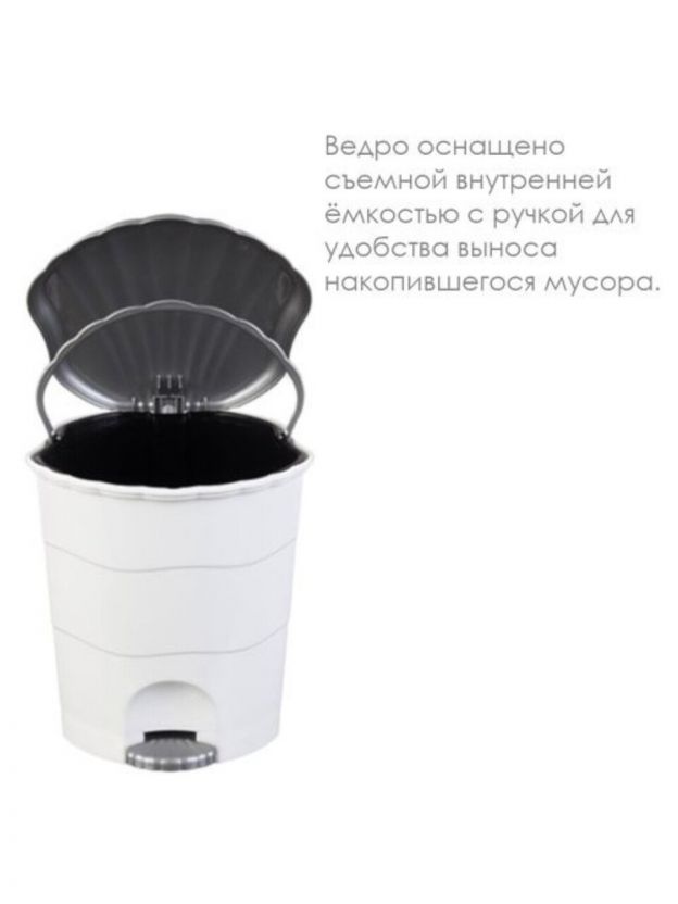 Изделие для накопления бытовых и пищевых отходов. Имеет элегантную крышку в форме ракушки, открывающуюся ножной педалью. Состоит из трех частей: внешнего корпуса с крышкой, внутреннего ведра с ручкой, педалью с приводным механизмом. Внутреннее ведро удобно вынимается из основного корпуса для выноса накопившегося мусора.