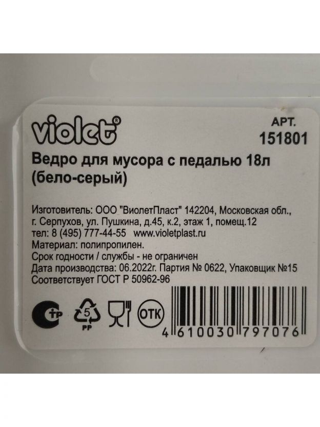 Контейнер для мусора пластик, 18 л, круглый, педаль, плавающая крышка, белый, серый, Violet, 151801