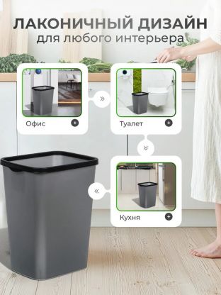 - Оптимальный размер бака пригодится для различного мусора и пищевых отходов и подойдет для кухни, туалета или ванной, будет уместно у туалетного столика или в рабочем помещении, офисе.