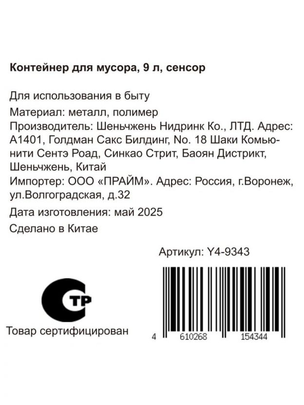 Контейнер для мусора пластик, 9 л, прямоугольный, сенсорный, без батареи, универсальное крепление, Y4-9343