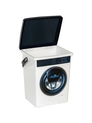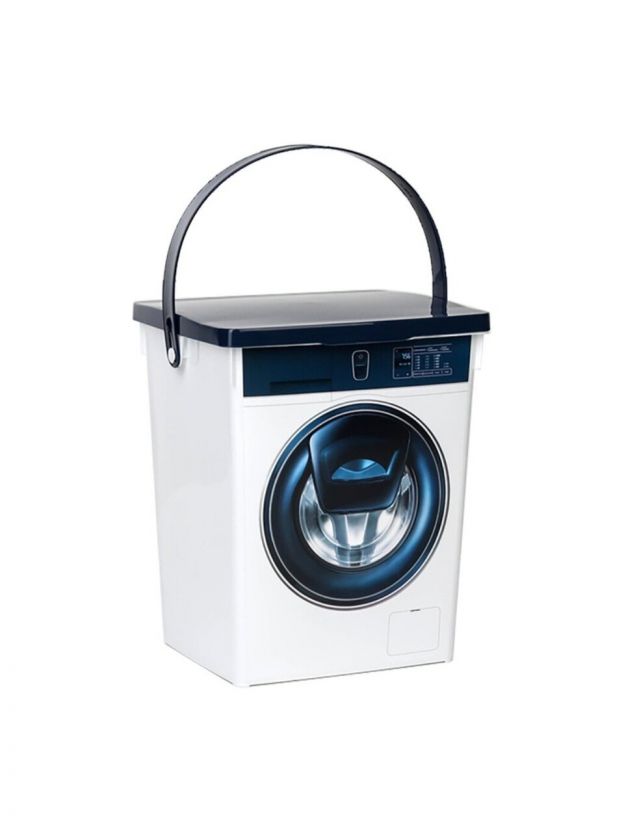 Сверху он закрывается надежной откидной крышкой. Контейнер очень вместителен и не позволит просочиться влаге. Декорирован принтом в виде стиральной машины. Для удобства переноски изделие снабжено прочной ручкой.