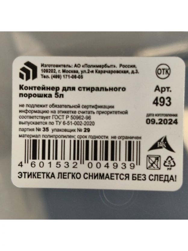 Контейнер для стирального порошка "Полимербыт" изготовлен из высококачественного пластика.
