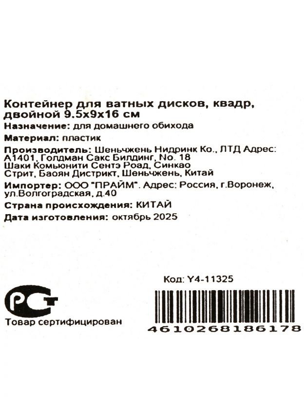 Какой размер у контейнера для ватных дисков Y4-11325?