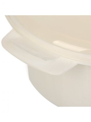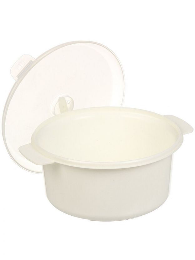 Объём — 1,75 л (округлённо 1,8 л), высота — 10,2 см, форма — круглая, материал — прочный пластик, цвет — бежевый.