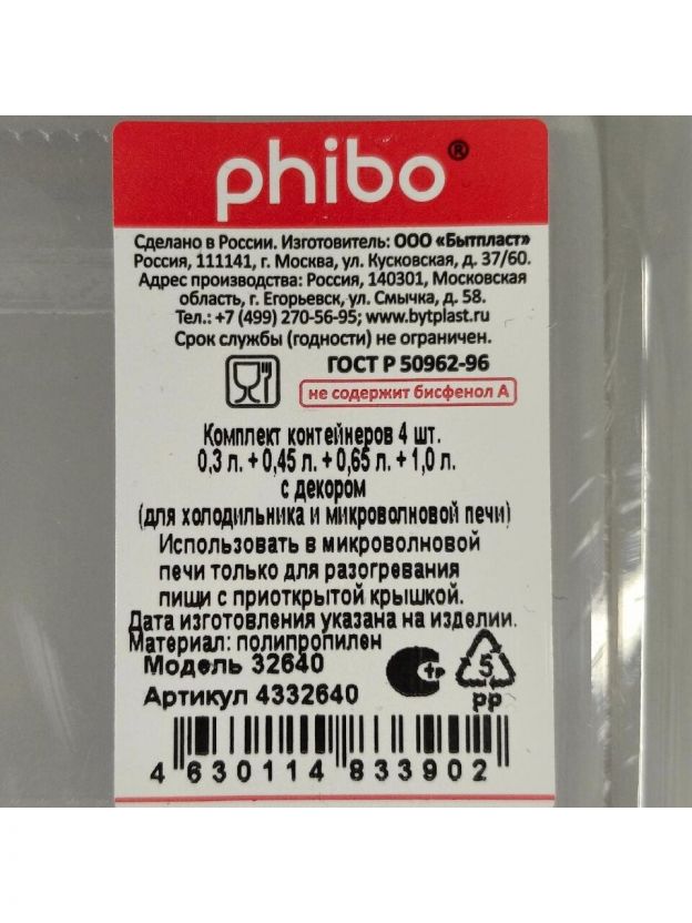 Контейнер пищевой пластик, 0.3, 0.45, 0.65, 1 л, 4 шт, в ассортименте, квадратный, с декором, Бытпласт, Phibo, С3264007