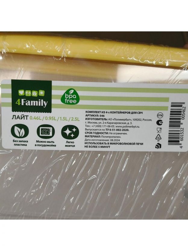 Набор пластиковых контейнеров Полимербыт Лайт 0.46–2.5 л: 4 размера, для хранения и заморозки, подходит для СВЧ и посудомоечной машины.